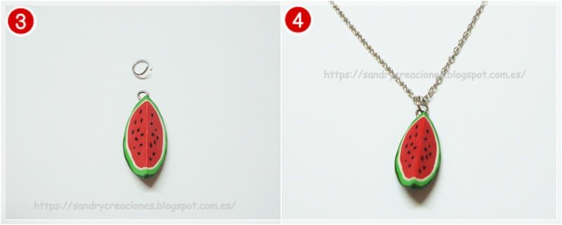 Una vez hecha la cadena montamos el colgante de la sandía con una anilla grande (imagen 3), lo suficientemente grande para que pase la cadena por ella, y pasamos el colgante por la cadena montada (imagen 4).