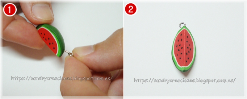 Una vez endurecido, procederemos al montaje de los pendientes y el colgante, para ello primero pondremos una hembrilla pequeña en cada trozo de sandía:
