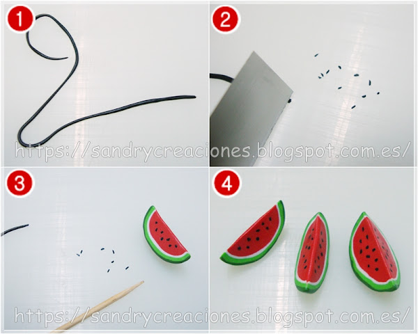 Para finalizar el modelado nos faltarían las pipas de la sandía, para ello hacemos un churro muy delgado con pasta polimérica negra (1) y vamos cortando trozos irregulares muy pequeños (2), luego con la ayuda de un palillo vamos colocando estos pequeños trozos de pasta polimérica negra repartidos por la parte roja de la sandía (3 y 4):