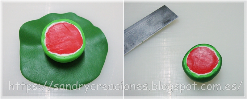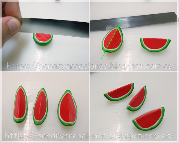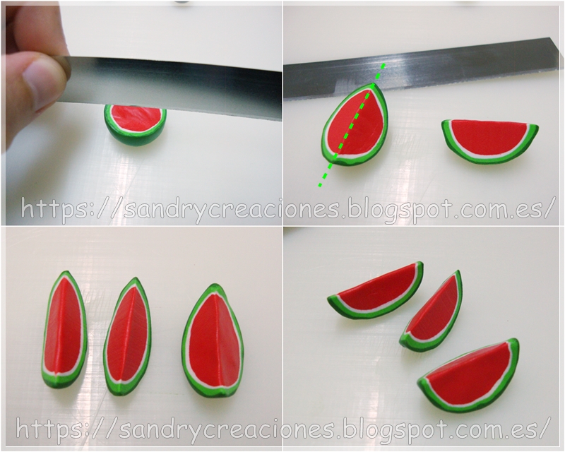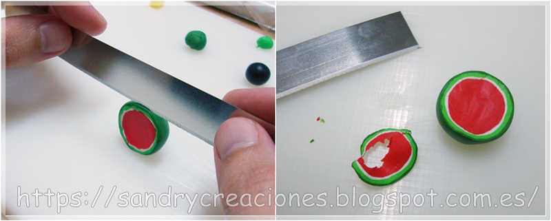 Con esto terminaríamos el modelado de los trozos de sandía y solo faltaría meterlos al horno para endurecerlos.