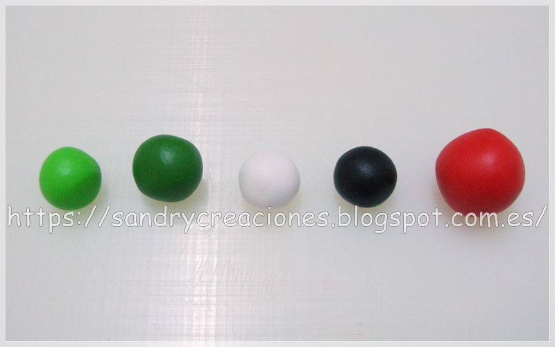 Para realizar los trozos de sandía necesitaremos un poco de pasta polimérica de los colores de la sandía, estos son: verde oscuro, verde claro, blanco, rojo y un poco de negro para hacer las pepitas de la sandía.
