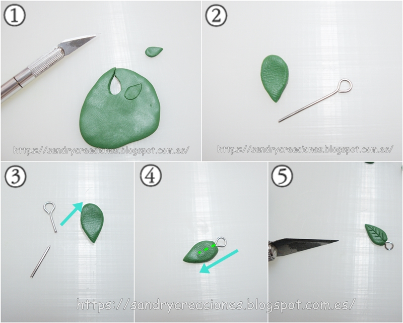 Una vez tenemos las cerezas montadas le pondremos una hojita a cada una. Para ello cogemos pasta polimérica verde, hacemos una bola, la extendemos y aplanamos con un rodillo, y con un cúter, dibujamos y cortamos 6 hojas (imagen 1). Seguidamente, cogemos 6 agujas pequeñas de bisutería con argolla y los cortamos más o menos a medida de la hojas (imágenes 2 y 3), para eso también podemos utilizar hilo metálico y hacer la argollita con unos alicates redondos. Una vez tenemos cortadas las 6 agujas, las insertamos en cada una de las 6 hojitas (imagen 4) y para finalizar, con un cúter, hacemos los detalles de la hoja (imagen 5).