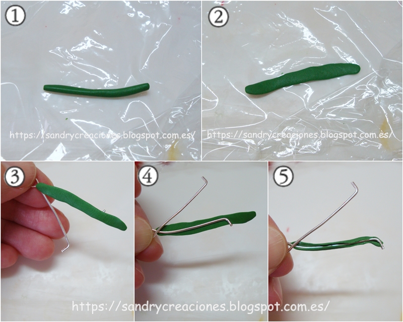 Lo primero que haremos es decorar lo que serían los dos palitos de las cerezas. Para ello cogemos pasta polimérica verde, hacemos un churrito bastante delgado (imagen 1), lo aplanamos con el dedo (imagen 2) y lo ponemos encima del hilo metálico (imagen 3 y 4), quitamos la pasta que nos sobre y cerramos la pasta por el lado contrario (imagen 5).