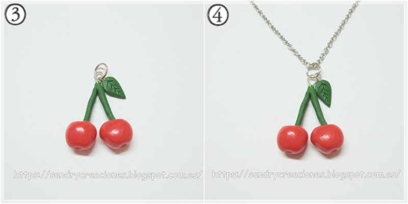 Endurecemos la pasta en el horno a la temperatura y tiempo que indique el fabricante y, una vez endurecida, para darle un toque de brillo, pulimos solo las cerezas con el invento de la bayeta y la Dremel que explicamos en esta entrada "Colgante hoja de otoño".