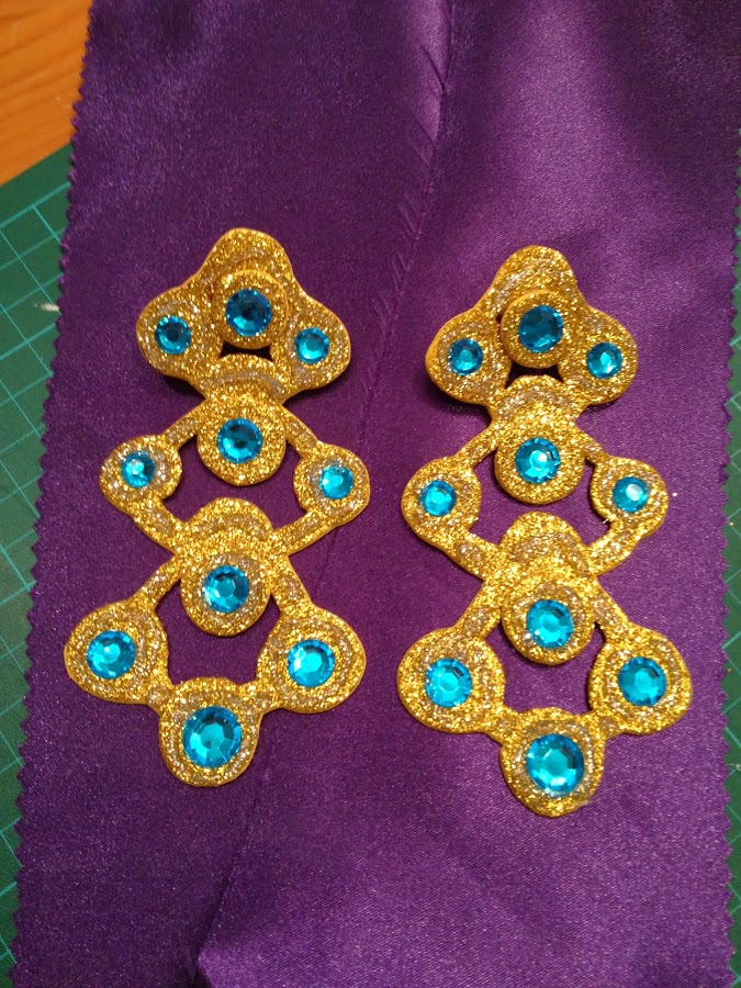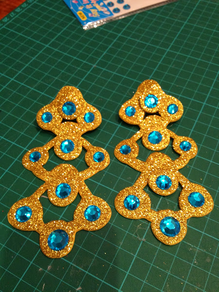 Pega con pegamento caliente los circulos a los pendientes, tal y como se ve en la foto. Añade los brillantes azules, y con el glitter plata decora alrededor de los circulos resaltando algunas zonas para conseguir efecto de filigrana. Pon una gota de pegamento caliente en los pendientes usados y pegalos a los pendientes que has hecho.
