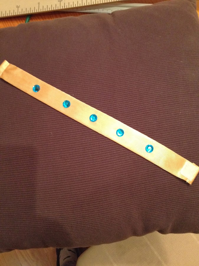 Corta una tira de raso dorado (pudes utilizar tambien una cinta de raso), de unos 30 x 6 cm, cosela por un extremo y dale la vuelta, planchala.Cortala a la medida de tu cuello, teniendo en cuenta que debes dejar 4 cm más de margen, para poner los velcros.