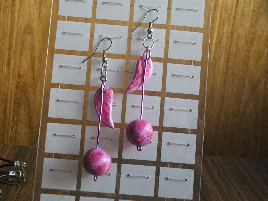 Estos son de arcilla polimérica y si os fijáis bien tienen dibujadas unas hojas, me encantan en especial y por ello es que estos me los he quedado yo, son los primeros que hice con arcilla polimérica y el resultado obtenido fue muy satisfactorio y como toda artista debería de llevar algo de su creación pues lo dicho que mi elección fueron estos fantásticos pendientes en rosita, ejjjejej