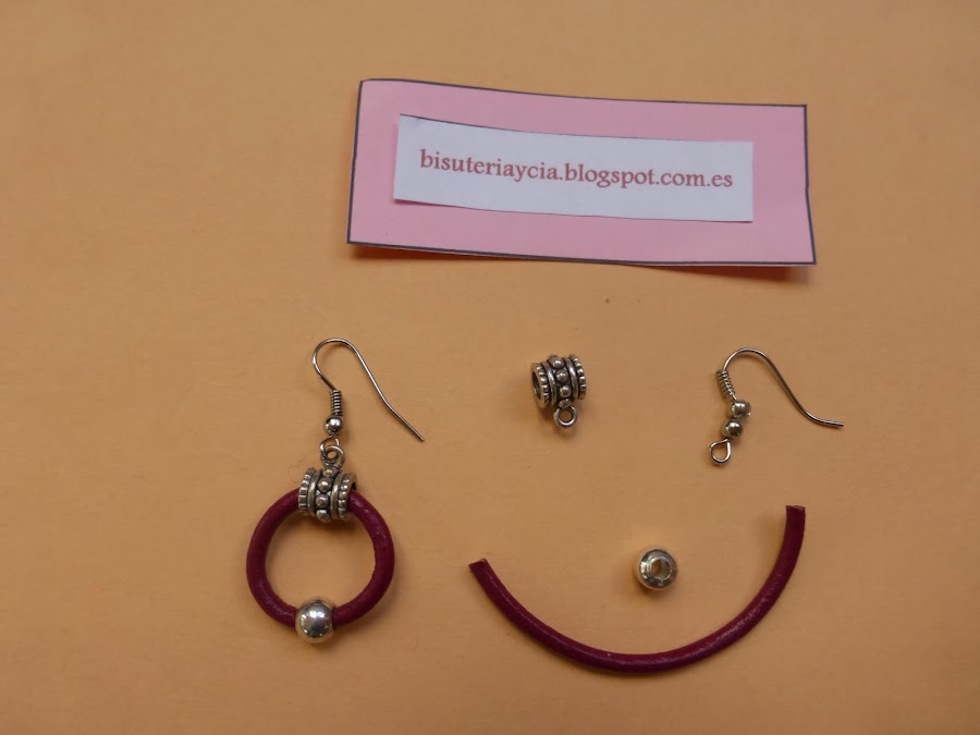 Para crear el primer par utilizaremos: cuero redondo rojo, rondeles con anillas, pendientes, y bolas plateadas.
