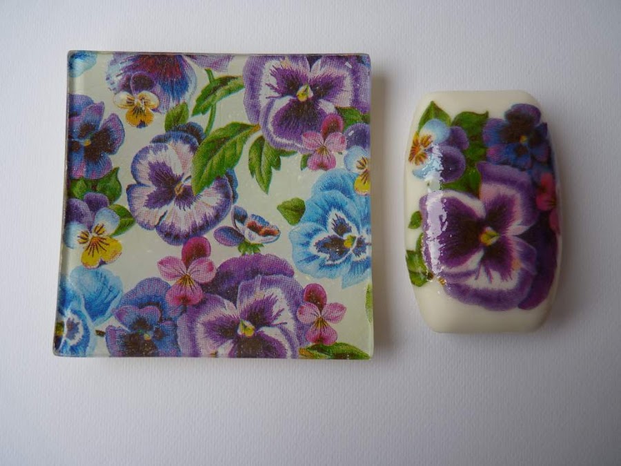 La técnica empleada ha sido la del decoupage, y después he tratado los objetos con barniz acrílico y barniz francés, que protege muy bien y da un acabado brillante que a mí me gusta mucho.