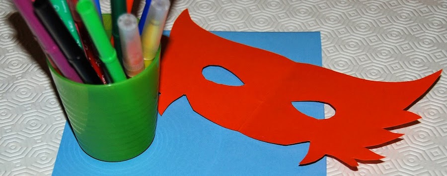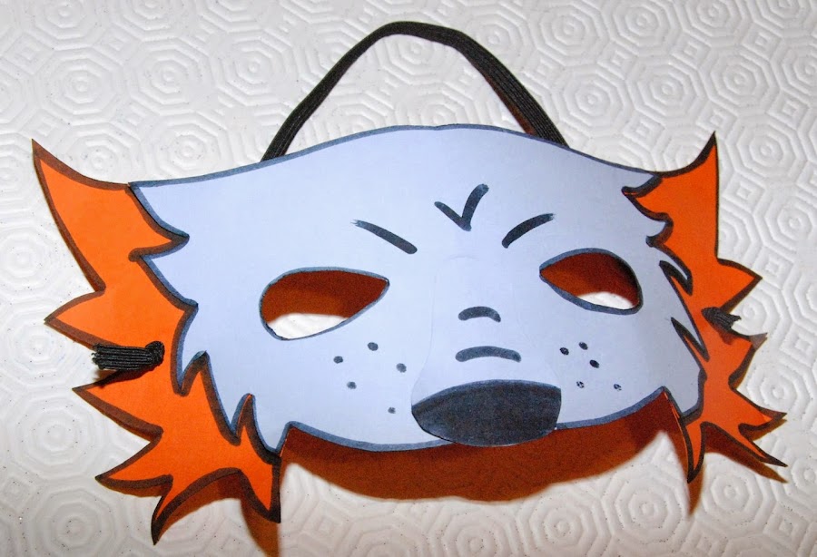 Pegamos todas las partes que hemos cortado para dar relieve y hacemos dos taladros para poner la goma elástica, a la altura de los ojos. Medirla, para que se ajuste a la cabeza.