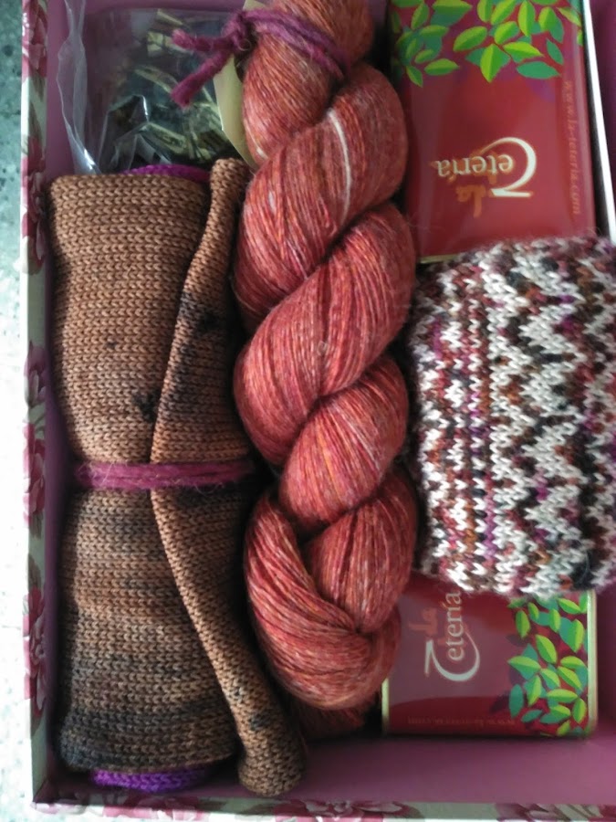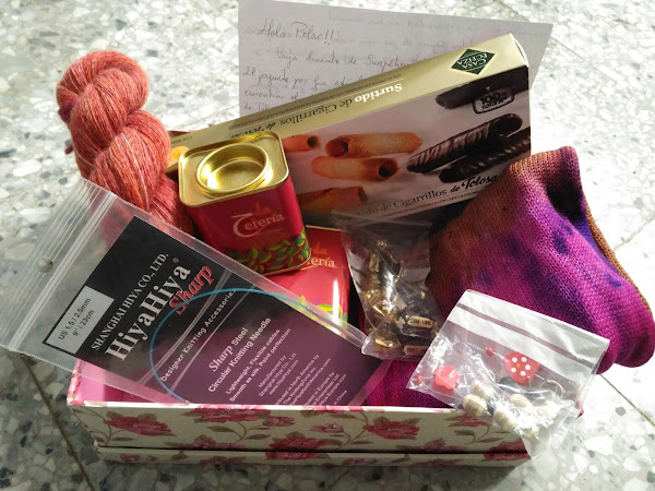 Y para que no se sintieran solos, en el paquete envió algunos acompañantes que aún me tienen salivando. Tés maravillosos, una lana hilada y teñida por ella, unas sock blanks teñidas por ella, caramelos de cuba libre (Que hacía años que no veía!) unos cigarros de chocolate belga (extintos), marcapuntos artesanales y mi primer par de agujas Hiya Hiya. Además de una carta muy cariñosa. Me ha hecho mucha ilusión tenerte como sorprendida, y espero conocerte pronto :)