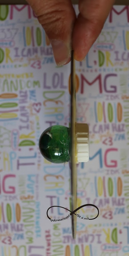 Aquí podéis ver la peonza puesta de perfil para que veáis como queda la canica/bola y el tapón.