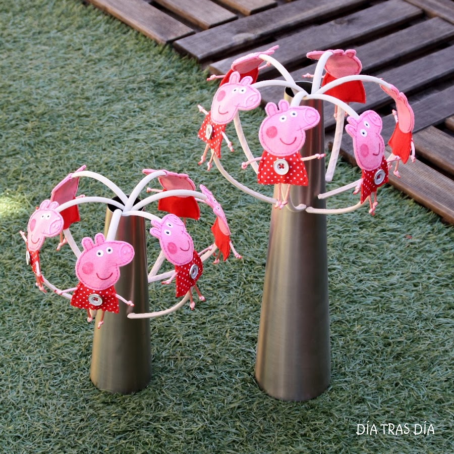 Pues en esta ocasión, el encargo que me hicieron, no fue de camisetas, cosa rara ;-). La persona que me hizo el encargo, Mar, en primer lugar me preguntó si podría hacer una diadema con Peppa Pig. Una vez que llegamos a la idea de cómo la quería, me pidió 12 diademas, para regalar a las 12 niñas de una clase de infantil.