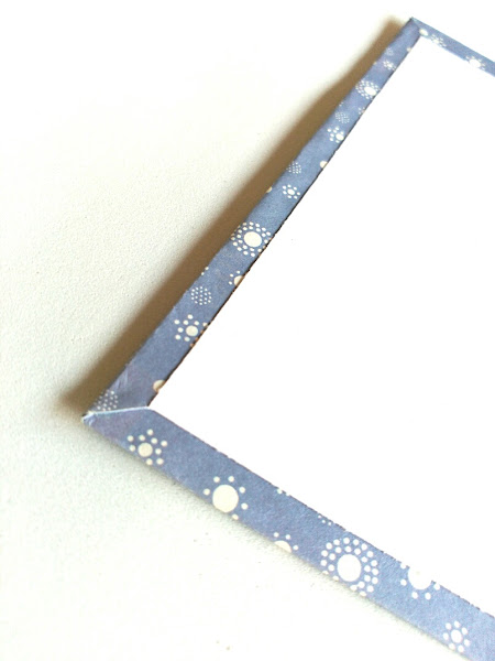 Cuando ya esté bien seco, empezamos a marcar y doblar el papel decorado que sobresale por los laterales sobre el cartón con la ayuda de una plegadora. Extendemos cola blanca para pegarlo y presionamos con cuidado con el paño de algodón. Dejamos secar de nuevo.