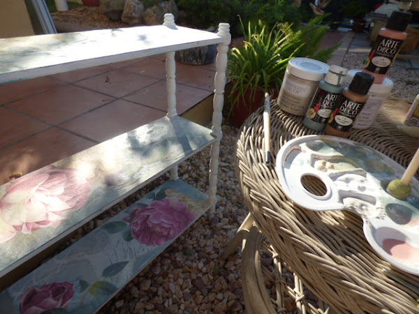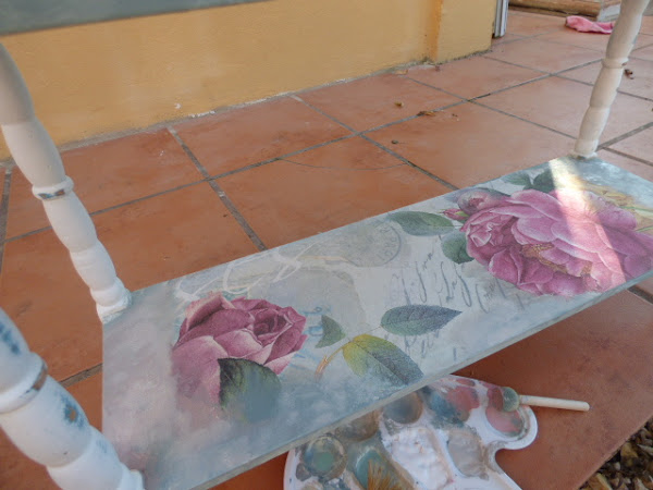 Y aqui intentando integrar las imágenes con varios tonos de acrilicas....un rosado, un verde azulado, un ocre.....
