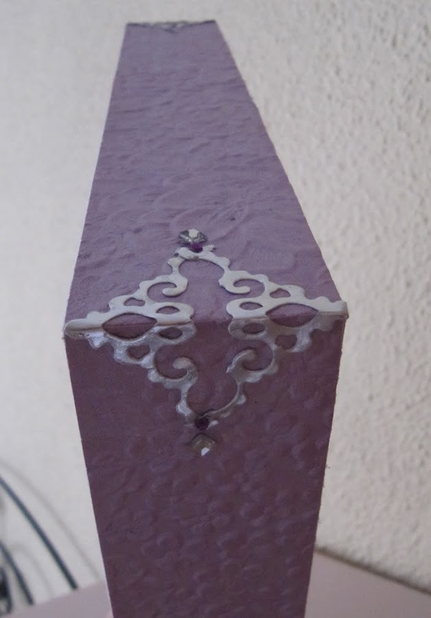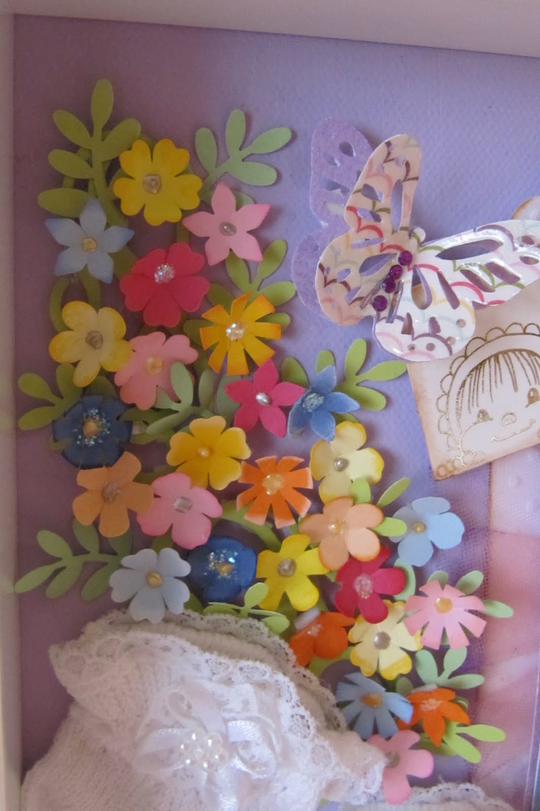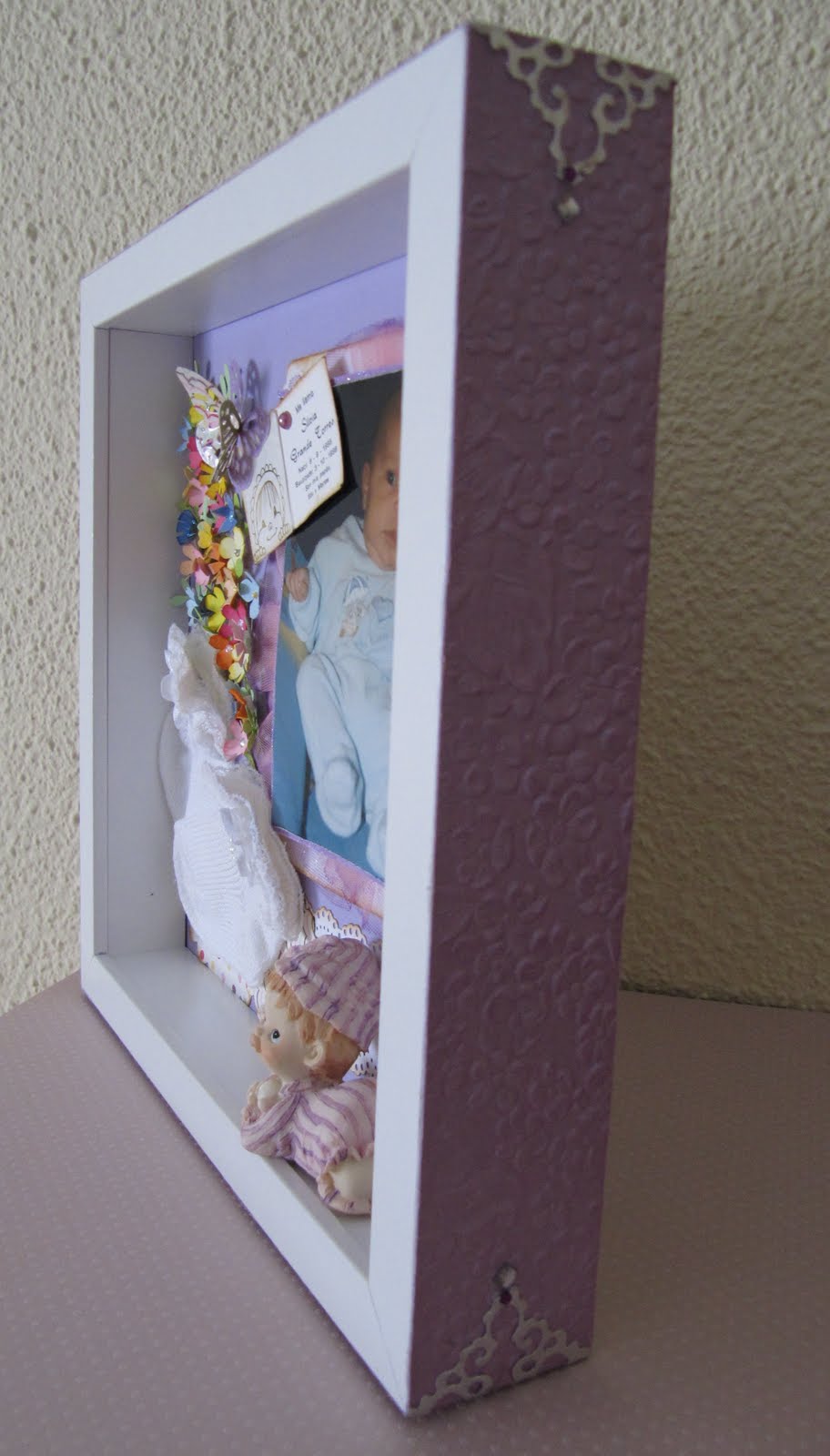 He utilizado un marco con profundidad de Ikea, la parte lateral la forre con un papel de un trabajo anterior, puse en las esquinas un troquel de Nellie’s con un brillantito lila (regalo de Patricia) y otro de Artoz y la parte frontal la deje blanca; la muñequita, el tul rosa, el letrerito son del bautizo; como los detalles que decidí de poner predominaba el blanco, pensé en pintar un lienzo con la pintura de la habitación; los papeles que he utilizado son EP de la colección Sprintime, que son muy dulces con un troquel de Spellbinders Nestabilities; troquel de borde de Martha Stewart envejecido con Distress –vintage photo- con unas perlitas de Toga; la foto está enmarcada con cartulina rociada con Glimmer, aunque no se aprecie, y otra cartulina que embose con una placa Sizzix y envejecida; el troquel que está en la foto es de Marianne; mariposa de Marta Stewart , dándole brillo con Glossy y unos brillantitos; el conjunto floral está hecho con cartulina de distintos colores, entintadas una por una con varios tonos de tintas (creo que hay 28 flores) , consiguiendo mucho colorido, utilice un troquel de McGil y en el centro iba poniendo según veía Stickles o Liquid Pearls de varios colores, pegadas con almodillas 3d; las hojas hechas con troquel de Ek Success