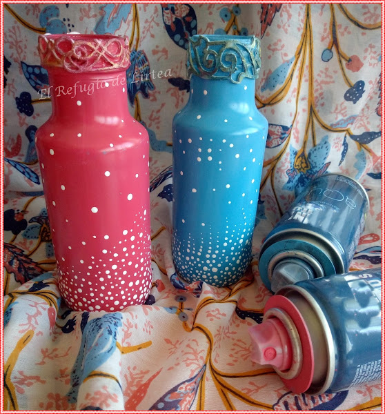 Como podéis ver son unas pequeñas botellas de refrescos que he reciclado pintándolas de colores vivos y alegres y haciendo adornos con la técnica del puntillismo.