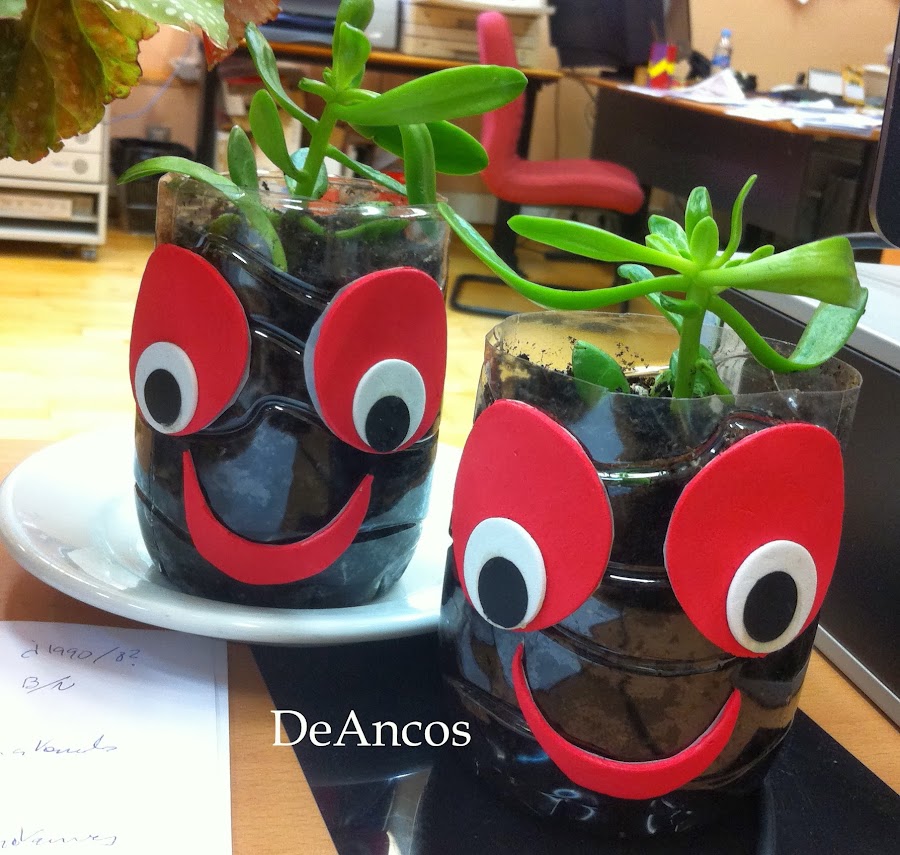 Una menudencia que acabo de hacer, y que no es scrap, son un par de tiestos en la parte de abajo de una botella de plástico. Además de la planta, evidentemente, únicamente le he añadido unos ojazos troquelados en goma eva. Como se aprecia en la foto, uno de ellos está sobre mi mesa de trabajo y el otro lo regalé a una compañera. ¿A que quedaron simpáticos? A todo el que lo ve, le sale una sonrisa al mirarlo. Aunque solamente sea por eso, merece la pena el haberlos hecho.