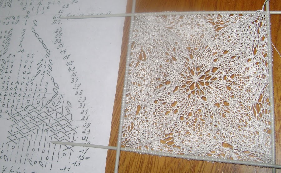 Levantamos 8 puntos y repartimos en 4 agujas.Después seguimos el esquema gráfico.