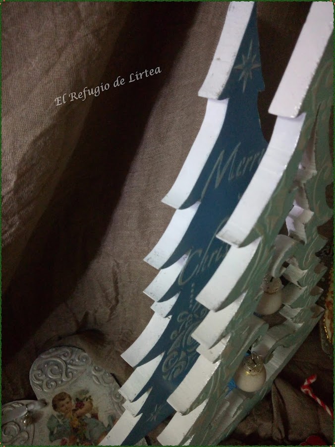 En un principio pensé hacer pequeños agujeros sobre el árbol posterior para poner luces, pero me gustó tanto como quedó que opte por la vela o las luces de colores que he puesto para que veáis como queda el efecto.