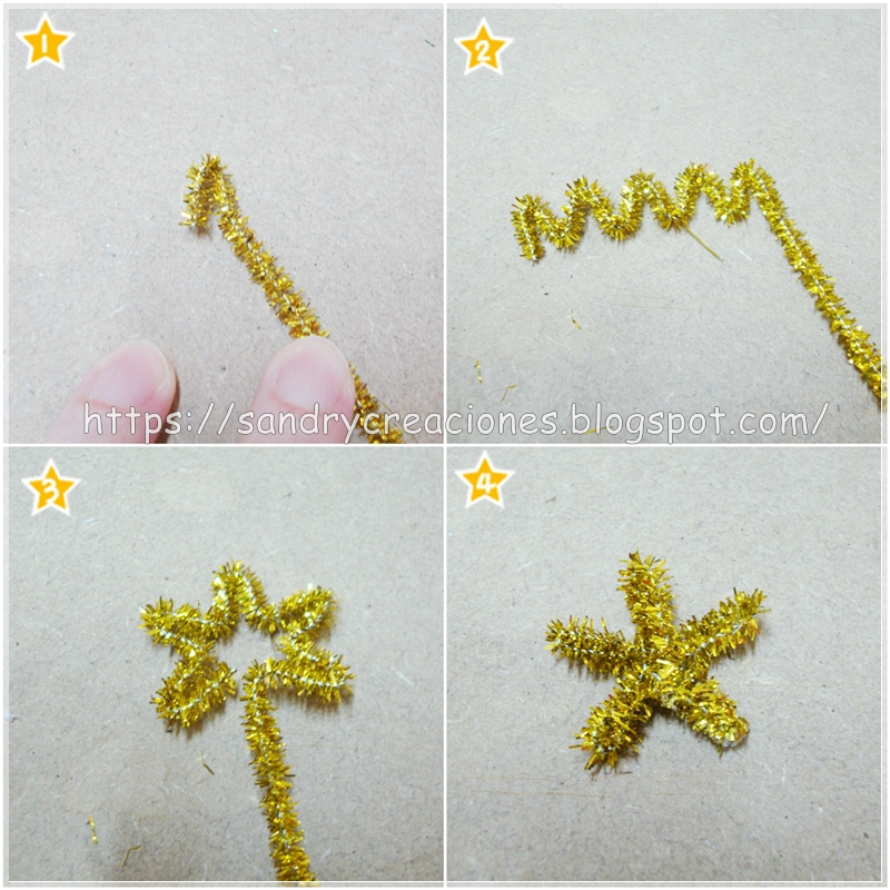 Una vez tenemos todos los árboles forrados y decorados ya solo nos queda poner el detalle de la estrella. Para hacerla también utilizamos un limpiapipas, esta vez dorado brillante, y lo vamos doblando en tantos pliegues como puntas queramos que tenga nuestra estrella (imágenes 1 y 2). La medida de estos pliegues también nos determinará el tamaño de nuestra estrella, en nuestro caso los hemos hecho pequeñitos de más o menos 1 cm porque necesitábamos estrellas pequeñas. Seguidamente con las manos vamos dándole a los pliegues la forma de estrella, recortamos el limpiapipas que nos sobre (imagen 3) y cerramos la estrella pegando sus extremos con silicona caliente (imagen 4).