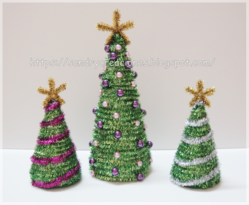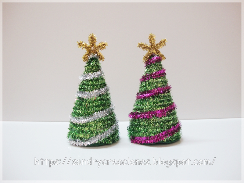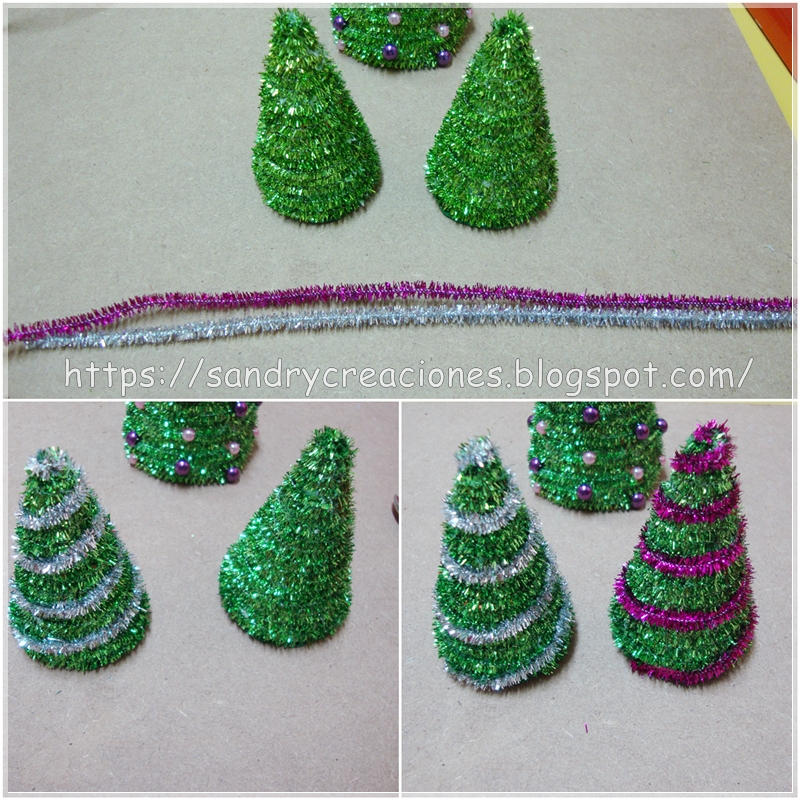 Para hacer los arbolitos más pequeños, simplemente los forramos con los limpiapipas verdes brillantes y una vez todo forrado le ponemos como adorno un limpiapipas brillante de otro color, en nuestro caso hemos hecho uno de plateado y uno de color rosa.