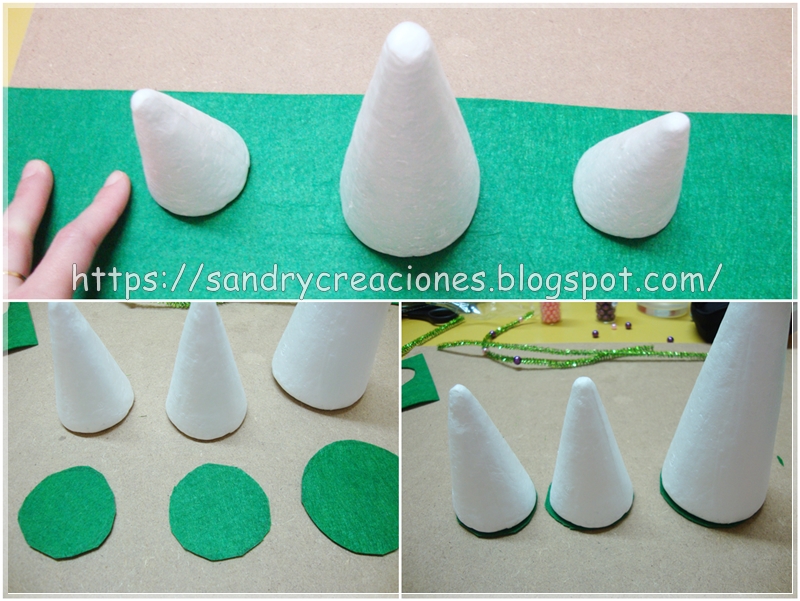 Lo primero que vamos a hacer es recortar unos círculos de fieltro verde según la medida de la base de cada cono de porexpan y los pegamos a la base del cono con silicona caliente.