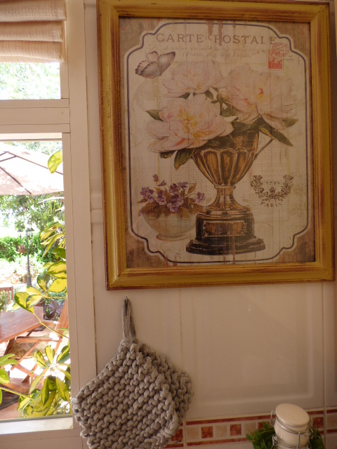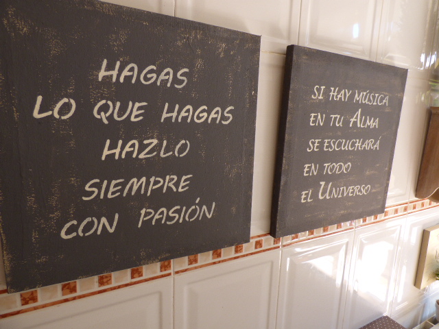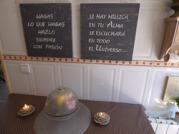 Estos lienzos tenían unos dibujos de motivos de Lavanda y hace....yo qué sé cuánto tiempo, los pinté de color crudo con idea de darles un nuevo aire. Pues si no hace 6 meses, hace un año.....increible haber estado tanto tiempo con dos lienzos en blanco, en el lugar de la casa dónde creo que más horas se está. No me venía ningún tipo de inspiración para ellos¡