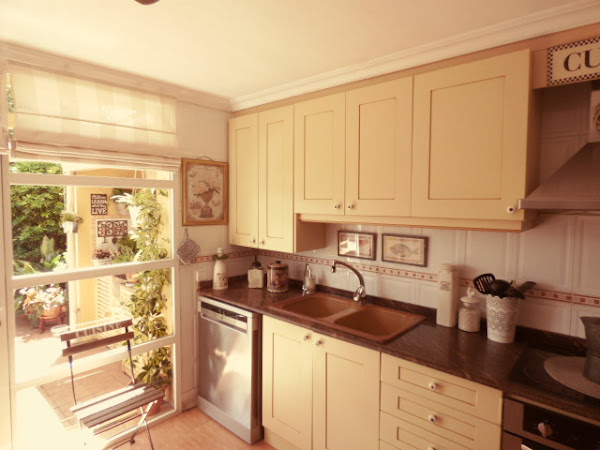 Hace 15 años cuando buscábamos casa y ví esta por primera vez, fué la cocina lo que me hizo enamorarme de ella por completo. Los muebles eran color pino y fué precisamente esta luz y las cristaleras. lo que más me gustó....ya no hubo ojos para otra y aunque al principio hubo problemas (porque había otras personas interesadas) y no parecía que pudiera ser nuestra, cuando ya casi la dábamos por perdida, todo cambió y pudo ser.....
