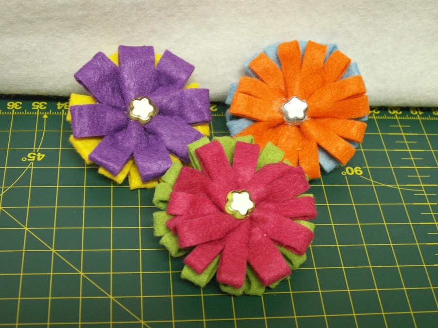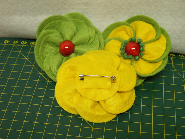 Estos broches están hechos con fieltro industrial, las típicas planchas que tod@s conocemos, cosidos y con un pequeño abalorio en el centro. Os pongo en la foto mas pequeña el reverso, para que veáis el tipo de alfiler que uso para prenderlos a la ropa.