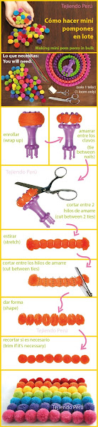 Este tutorial, que tomé de un excelente sitio web, "Tejiendo Perú" (http://www.tejiendoperu.com/), es sumamente útil a la hora de realizar pequeños pompones, toda vez que tengamos que hacerlos en grandes cantidades.