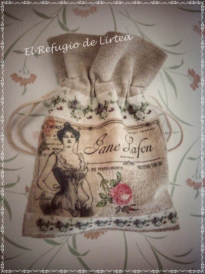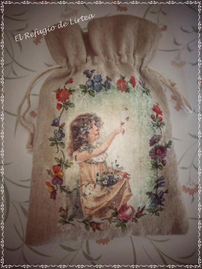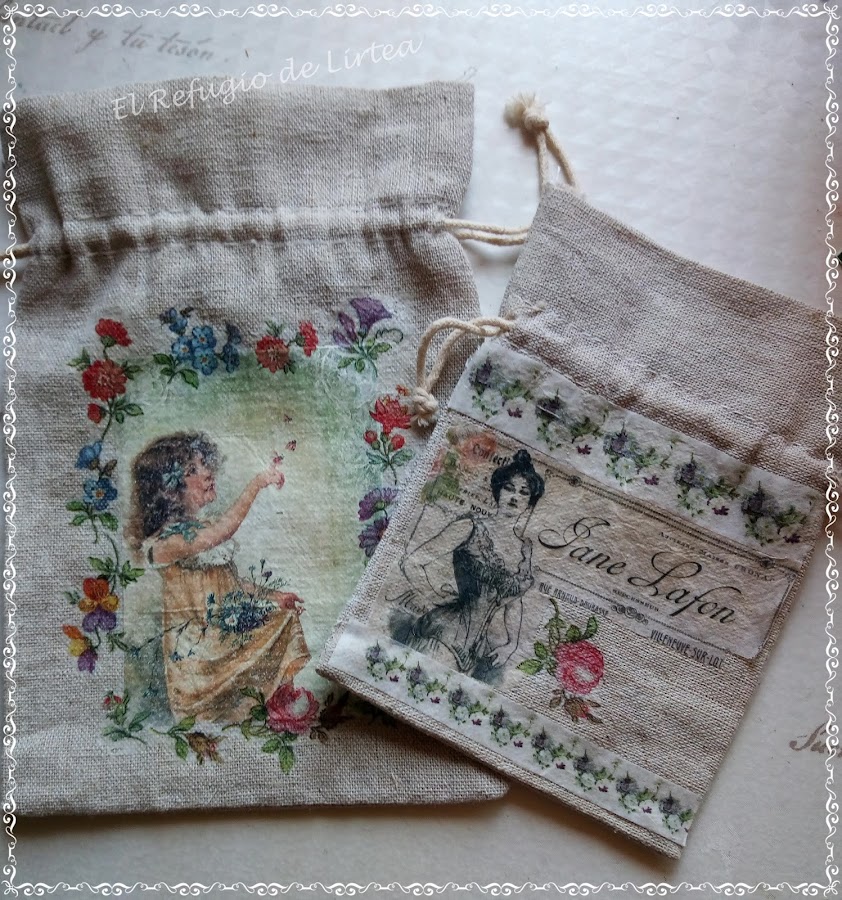 Hoy hago el decoupage sobre estos dos pequeños sacos que son como de tela de saco o rafia, no sé exactamente el tipo de tela, ya sabéis que la costura no es lo mio.