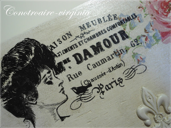 Las tapas .......bueno, con estas estuve experimentado un poco, quería hacer una especie de imitación a oxido o algo así, empece pintando toda la tapa de negro. Luego a golpecitos con un pincel duro, fui dando toques de negro, naranja y rojo, diluyendolo con agua. Como acabado, cera transparente con polvo de oro viejo.