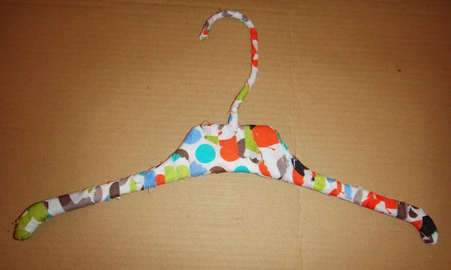 Es tan fácil como ir dando vueltas a las tiras de tela alrededor de la percha. Solo hace falta poner pegamento al principio y al final de cada tira, con eso es suficiente para que se sujete.