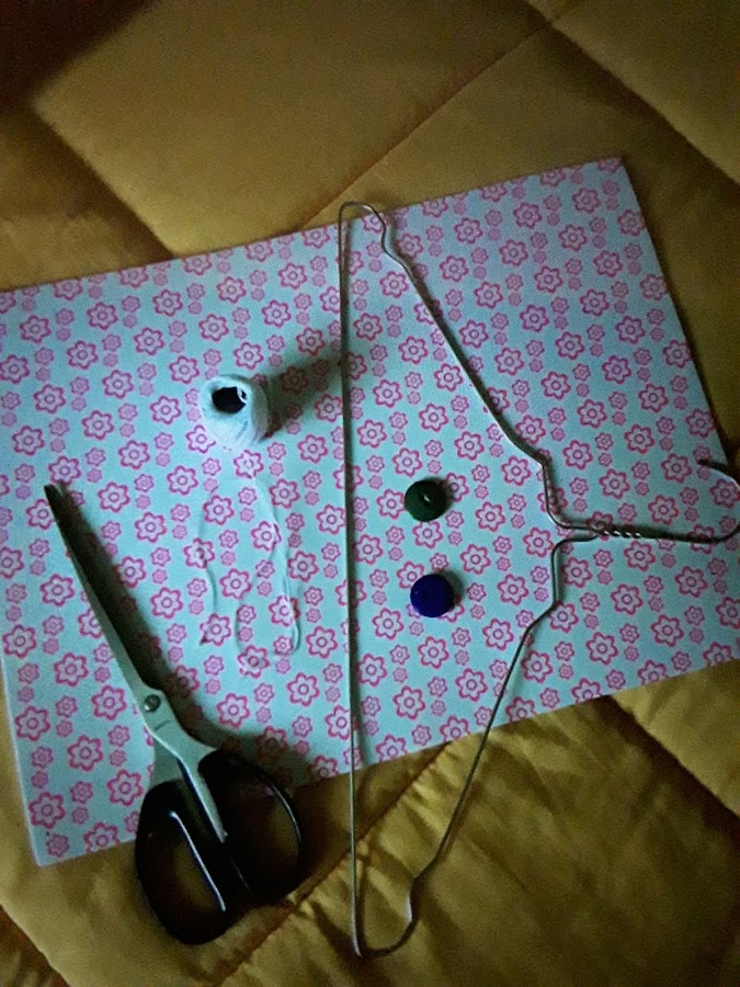 Aquí tenéis lo que necesito: la percha que nos entregan con la prenda en cuestión,una hoja de goma Eva,dos botones ,aguja,hilo y tijeras. Asi es como cambio mi percha.