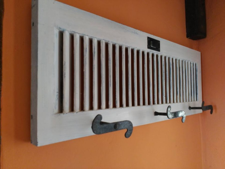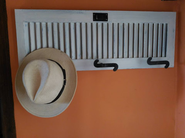 una de ellas tenía una parte con la madera fatal así que ha necesitado una sesión de corte antes de la chapa y pintura...reconvertida en un perchero para una casa rural...el color azul profundo y blanco antiguo para desgastar...la terminación a la cera...y los percheros los propios fijadores que tenían las contraventanas para sujetarse abiertas...en la parte de arriba su pasador original...funcional y con una nueva vida...y lo mejor...lo mucho que he disfrutado haciéndolo...poco a poco... más