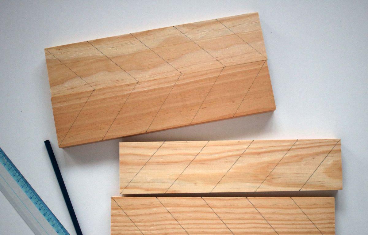 1- En primer lugar, para mi idea de perchero de madera, reservé dos de los listones. Dibujé una espiga en los otros cuatro de la manera que veis en la imagen con ayuda de lápiz y regla.2- Cortar: Con mucho cuidado, corté con la ingletadora los cuatro listones por las líneas que conforman las espigas que he dibujado. De esta manera conseguimos un lote de piezas con las que trabajar como si se tratara de un puzzle.