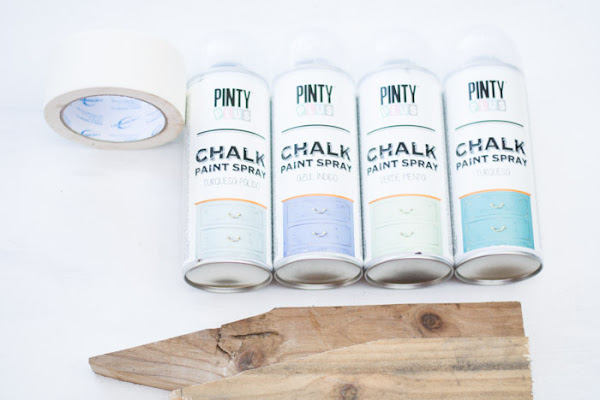 Necesitamos: Tablas de madera, cinta de carrocero, pegamento súper fuerte o grapadora eléctrica, pintura en spray chalk paint de Novasol.