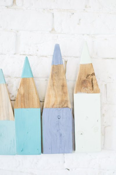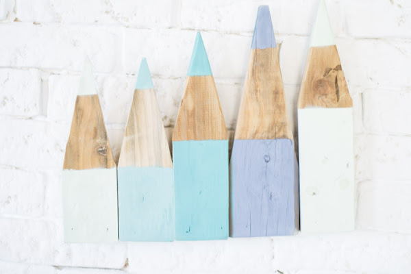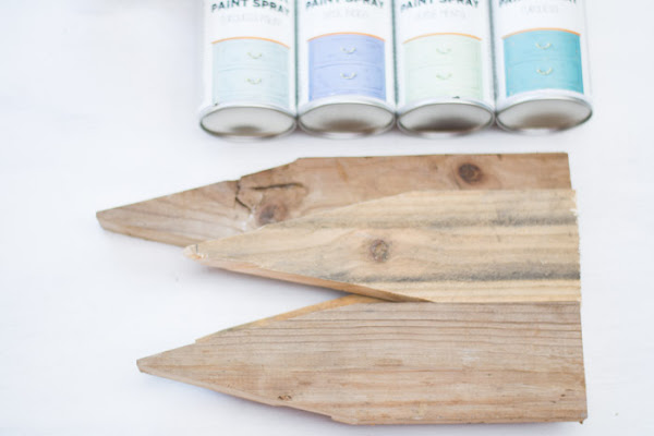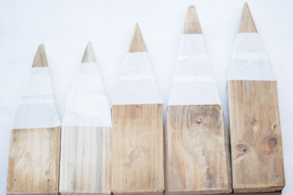 Cortamos las tablas de madera al tamaño que más nos guste. Yo hice de diferentes tamaños, y terminamos en punta. Con la cinta de carrocero tapamos la parte de madera que no queramos pintar.
