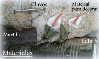 Una lata. Martillo y clavos de dos tamaños. Alambre. Pistola de silicona, cola escolar blanca. Vela. Para decorar: Cintas de tela, Flores y hojas de porcelana fría. Inicialmente pensé utilizar estas calitas, pero resultaron muy grandes y utilicé flores mas pequeñitas.