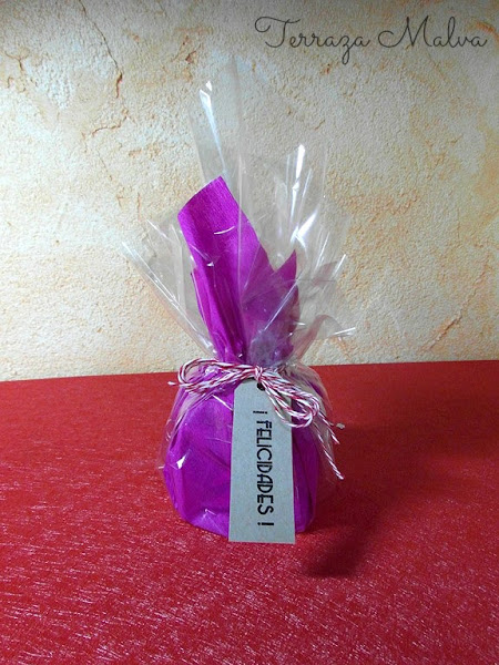 En el empaquetado he utilizado papel crepé color rosa fuerte y una etiqueta en cartulina kraft atada con bakers twine.