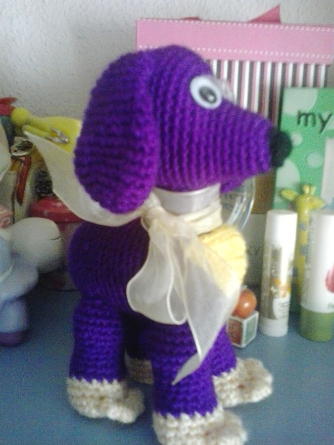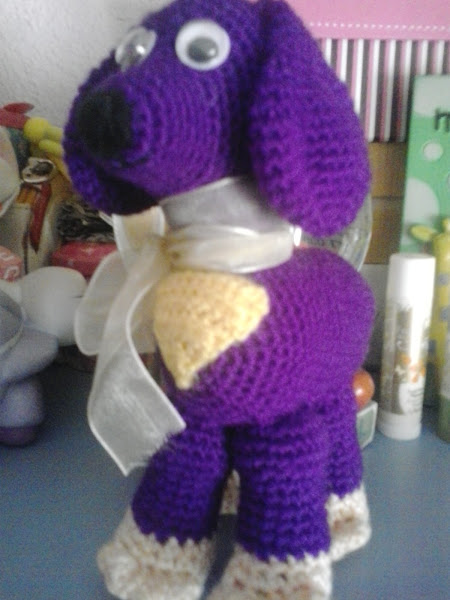 Durante mi estancia en Madrid hice este perrito y le pusimos un lazo precioso que mi hermana tenía guardado. Bien pues estamos otra vez con una gran incertidumbre por parte de mi sobrina: "regalo el perrito o me lo quedo" Cuando me vine no lo tenia nada claro pero lo malo es que la semana pasada aun no había decidido que hacer pero estaba casi segura que se lo quedaba, es decir, tengo que hacer otro perrito igual, pero igual para que lo regale.