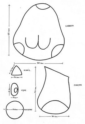 3. Para realizar el hocico, coser a máquina el cordón negro. Para los cachetes, colocar dos círculos de polar rosa a los costados del hocico, acomodar debajo de los mismos, la pieza de sonido, sujetar con alfileres y coser a máquina por el contorno.Para la costura, enfrentar los derechos de las piezas de la cabeza, sujetar con alfileres, coser a máquina con costura recta por el contorno, dejando una abertura de 15 cm en la parte superior de la cabeza para dar vuelta. Luego introducir la guata en forma prolija haciendo que llegue bien a los bordes de la pieza, hacer un doblez en dicha abertura, colocar alfileres y coser a máquina.