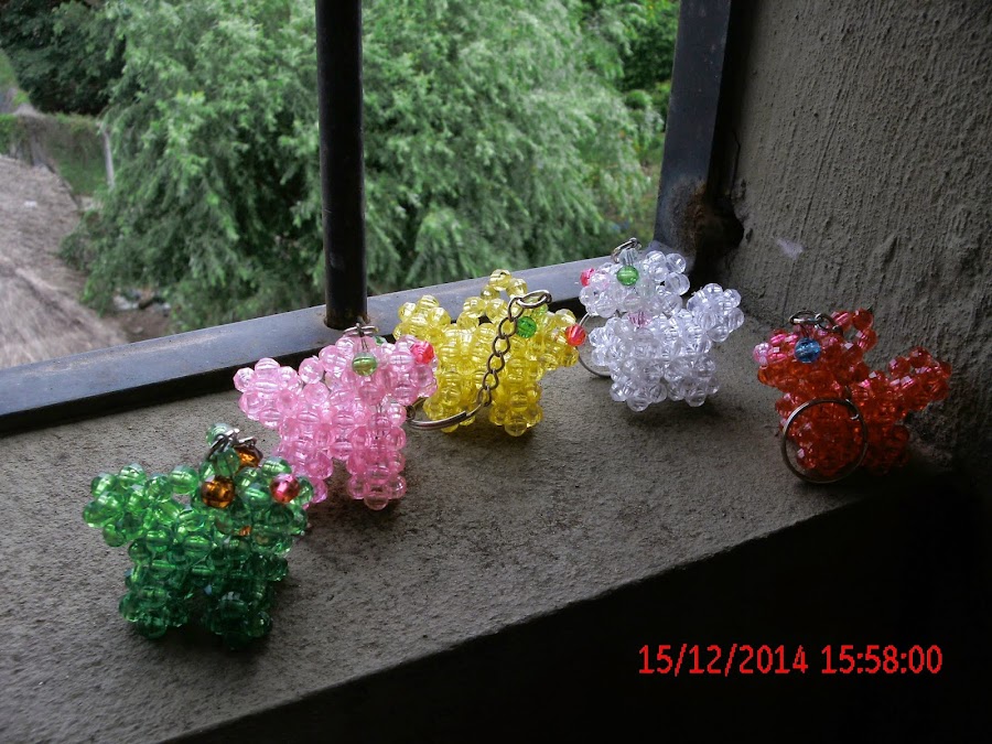 ESTOS PERRITOS LOS HICE CON CUENTAS FACETADAS UNIDAS CON HILO DE NAILON QUE SE UTILIZA TAMBIÉN PARA LAS CAÑAS DE PESCAR Y UNA CADENA CON ARGOLLA PARA PONER LAS LLAVES, LOS MATERIALES SON TRES NADA MAS Y SON FÁCILES DE REALIZAR, NO TENGO PATRÓN, HACE MUCHO TIEMPO QUE LOS HICE Y NO RECUERDO DE DONDE LOS SAQUE, PERO RECORRIENDO INTERNET ENCONTRÉ QUE HAY MUCHOS DE DISTINTAS FORMAS