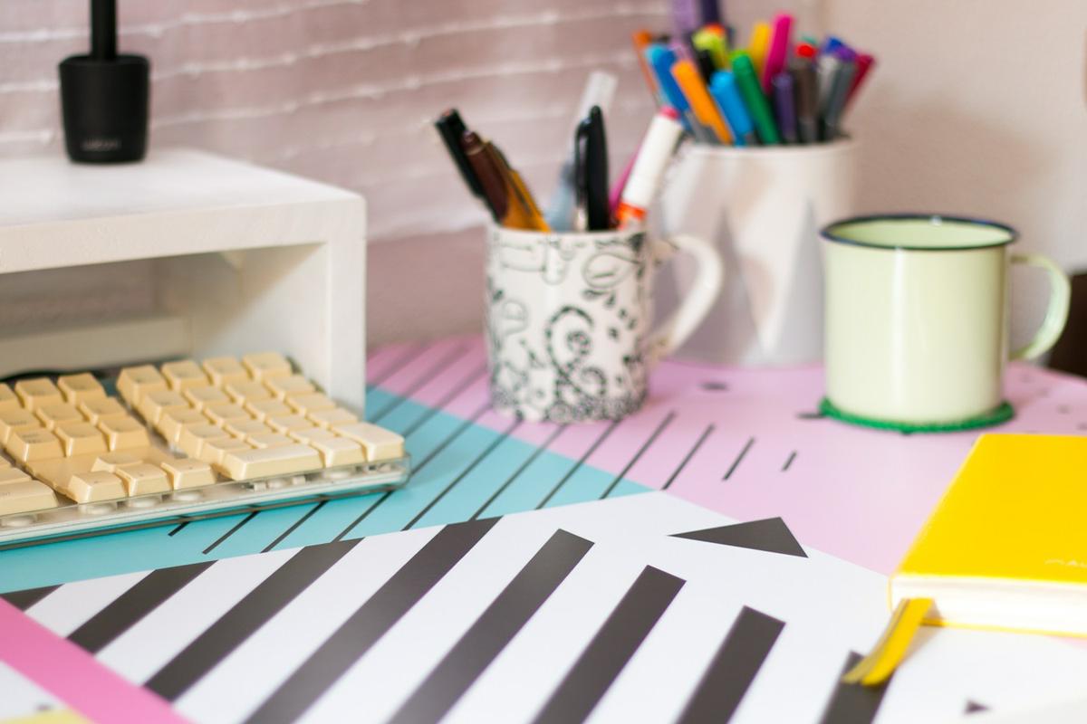 Pensé en personalizar una cajonera, una cómoda, el frigorífico, varias puertas por toda la casa, la trasera de las estanterías ¡incluso las paredes de los escalones! (esto hubiera sido divino de la muerte). A final, ganó mi mesa de escritorio.