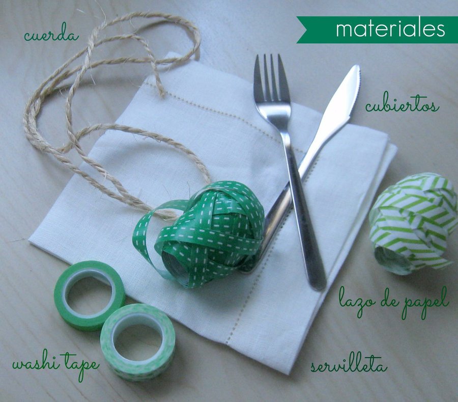 Para ello necesitamos; unos whasi tapes, unas cintas, un pedazo de cuerda, una servilleta y los cubiertos.