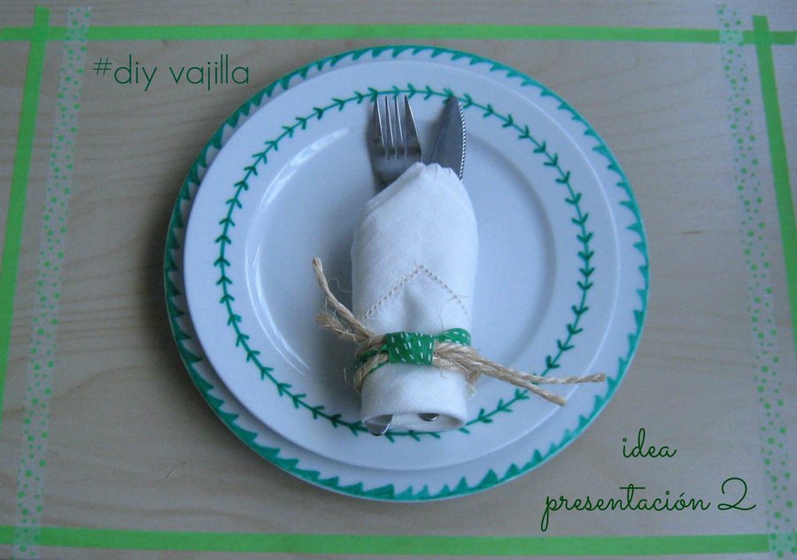 Ahora que ya tenemos nuestros platos terminados, vamos con dos ideas de presentación sencillas y originales con cosas que tenemos por ahí de otras manualidades, los whasi tapes y las cintas, ya las utilizamos en los detalles que regalamos en la comunión de mi peque, si te apetece verlos pincha aquí.