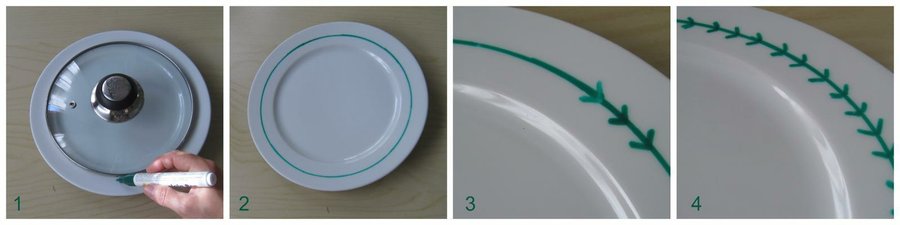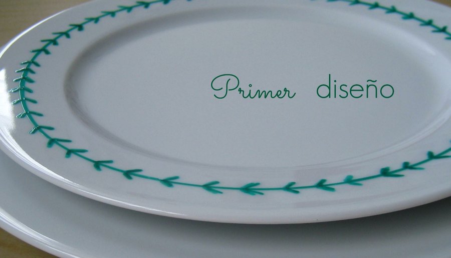 Para el diseño del primer plato, hemos empleado una tapa de una cazuela para realizar un circulo, lo hemos perfilado con el rotulador y después hemos realizado unas pequeñas "uves" intentando que queden a la misma distancia, un dibujo sencillo pero creo que para ser la primera vez no ha quedado mal, no?
