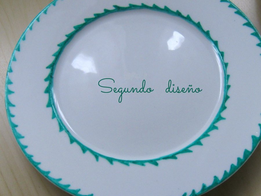 En el segundo plato hemos variado el diseño, marcando dos círculos en los bordes interior y exterior del plato, en esta ocasión le hemos hecho unos "piquitos" o "dientes" más o menos equidistantes. Otro dibujo sencillo y fácil de hacer sin necesidad de ser muy buenos dibujando ;)