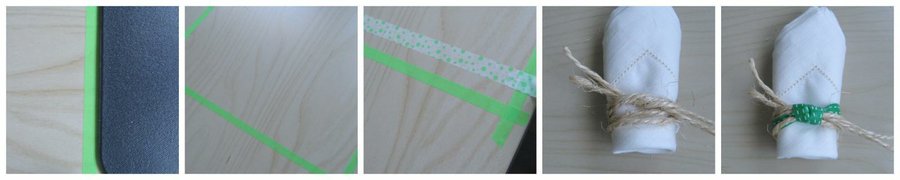 En la mesa con los washi hacemos unos rectángulos a modo de mantel individual para enmarcar nuestros platos, enrollamos las servilleta y la anudamos con las cintas y la cuerda, por último colocamos los cubiertos en su interior y lo presentamos al lado de la vajilla.